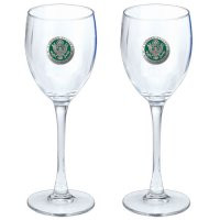 This is a set of two 12 ounce glass goblets with a fine pewter logo medallion bonded to the side. It could be used to serve water, wine or other beverages. Made in USA.