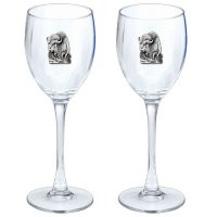 This is a set of two 12 ounce glass goblets with a fine pewter logo medallion bonded to the side. It could be used to serve water, wine or other beverages. Made in USA.