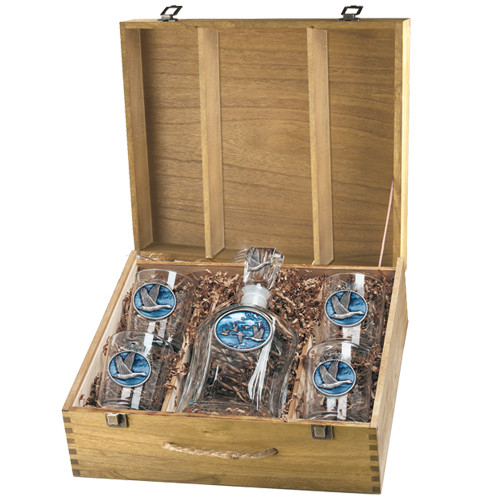 This boxed set contains one 24 ounce glass decanter and four (14 ounce) double old fashioned glasses. Each is embellished with a fine pewter casting.