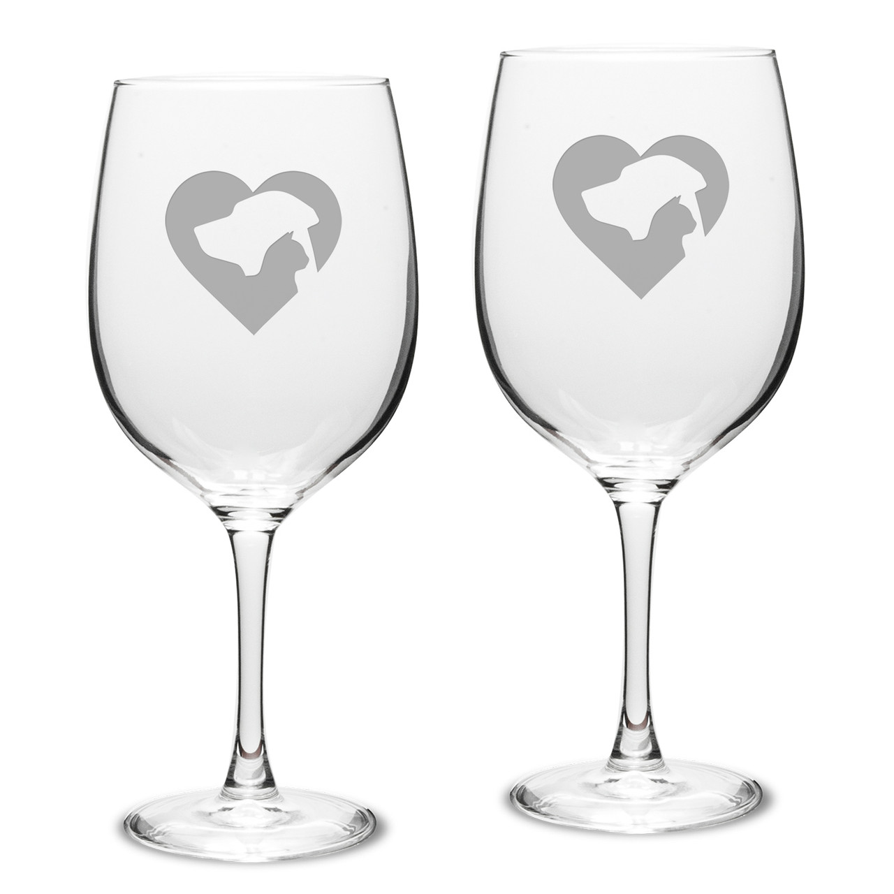 Cat Dog Heart Deep Etched Classic Red Wine Glass Set of 2