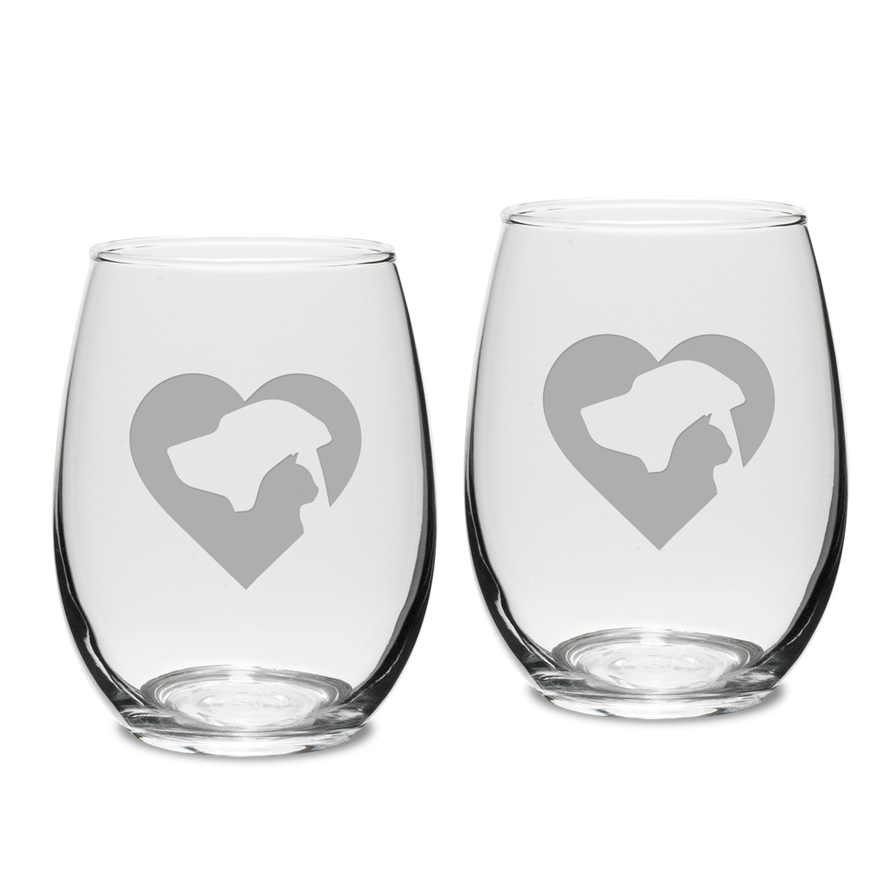 Cat Dog Heart Deep Etched Stemless White Wine Glass Set of 2