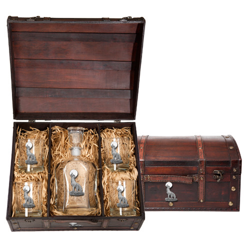 This chest boxed set contains one 24 ounce glass decanter and four (14 ounce) double old fashioned glasses. Each is embellished with a fine pewter casting.