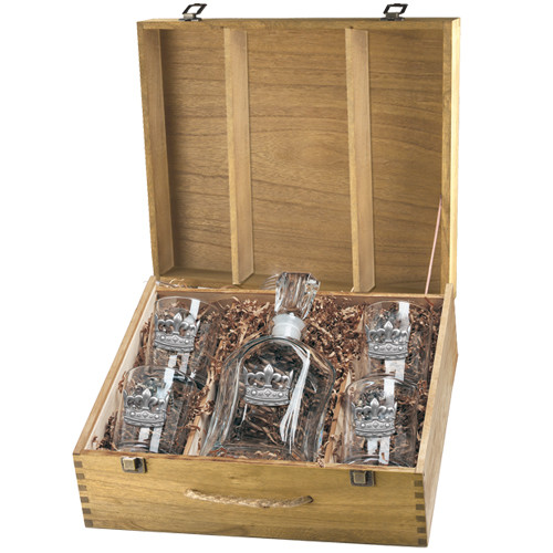 This boxed set contains one 24 ounce glass decanter and four (14 ounce) double old fashioned glasses. Each is embellished with a fine pewter casting.