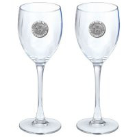 This is a set of two 12 ounce glass goblets with a fine pewter logo medallion bonded to the side. It could be used to serve water, wine or other beverages. Made in USA.