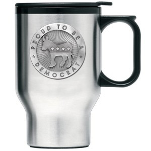 This double wall stainless steel Proud to be a Democrat travel mug is insulated and it is stainless inside and out. It is embellished with a fine pewter decorative casting. The lid has a non-spill feature. 14 oz.