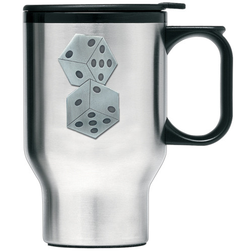 This double wall stainless steel travel mug is insulated and it is stainless inside and out. It is embellished with a fine pewter decorative casting. The lid has a non-spill feature.