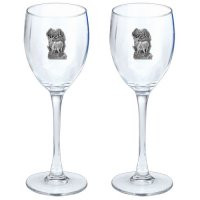 This is a set of two 12 ounce glass goblets with a fine pewter logo medallion bonded to the side. It could be used to serve water, wine or other beverages. Made in USA.