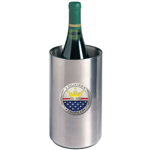 This is a wine chiller made of double-wall insulated stainless steel with a fine pewter logo medallion bonded to the front. The pewter logo is embellished with an epoxy enamel blue, red, and yellow.