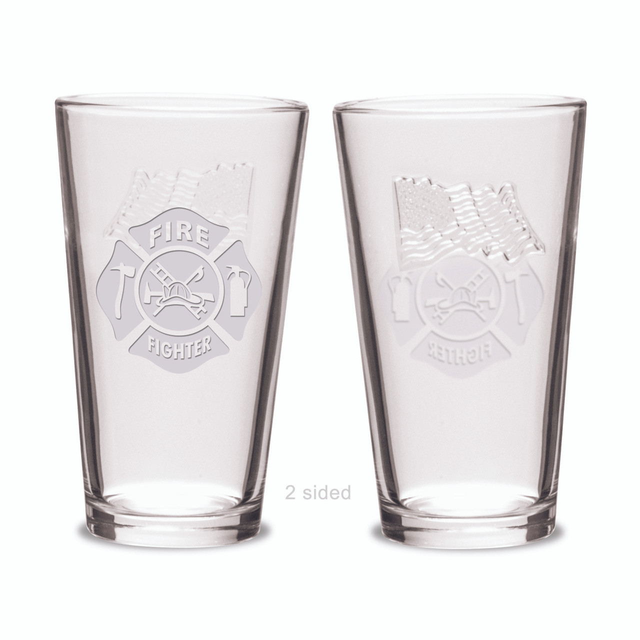 Firefighter 16 oz Crystal American Flag Glass This sophisticated product line uses a deep etch process which provides the most beautiful and enduring decorated glass gifts available today. Designed to be used with limited breakage on a daily basis, dishwasher safe. Made in the USA