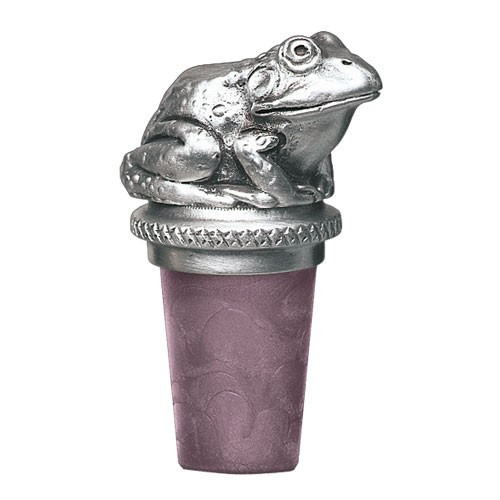 This frog bottle stopper is cast in solid fine pewter. The synthetic cork will not stain or crack. It comes equipped with a chain attached to a ring which goes around the bottle's neck. Made in USA.