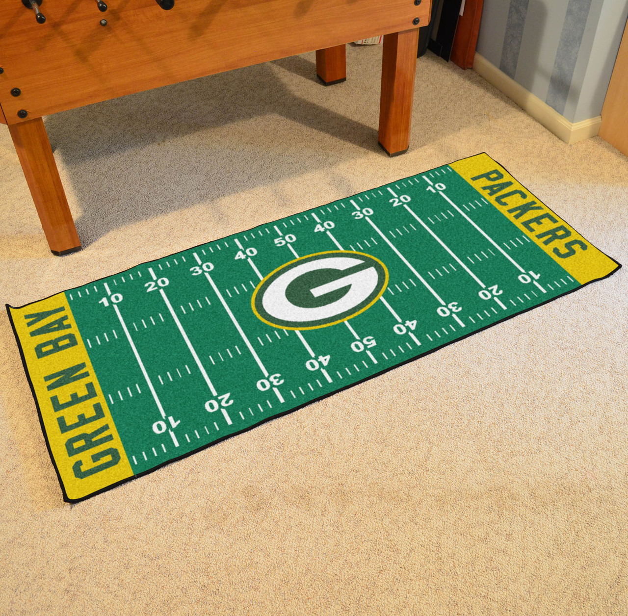 For all those football fans out there: football field-shaped area rugs by FANMATS. Made in U.S.A. 100% nylon carpet and non-skid recycled vinyl backing. Machine washable. Officially licensed. Chromojet printed in true team colors.