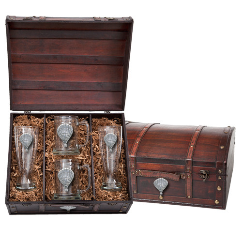 This boxed set contains two (20 ounce) glass pilsners and two (15 ounce) steins. Each is embellished with a fine pewter casting.