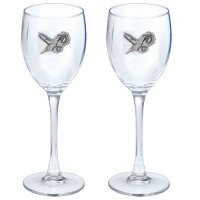 This is a set of two 12 ounce glass goblets with a fine pewter logo medallion bonded to the side. It could be used to serve water, wine or other beverages. Made in USA.
