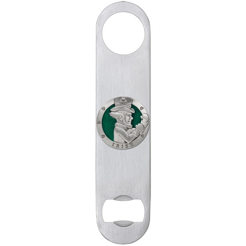 This bottle opener is solid stainless steel with a decorative fine pewter accent casting. The hole opposite the opener is for hanging on a peg.