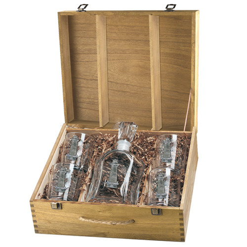 This boxed set contains one 24 ounce glass decanter and four (14 ounce) double old fashioned glasses. Each is embellished with a fine pewter casting.