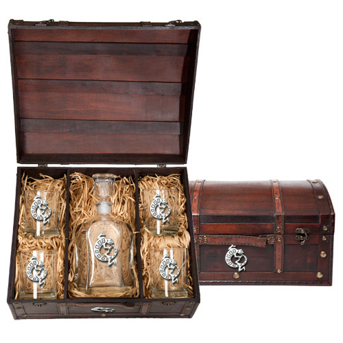 This chest boxed set contains one 24 ounce glass decanter and four (14 ounce) double old fashioned glasses. Each is embellished with a fine pewter casting.