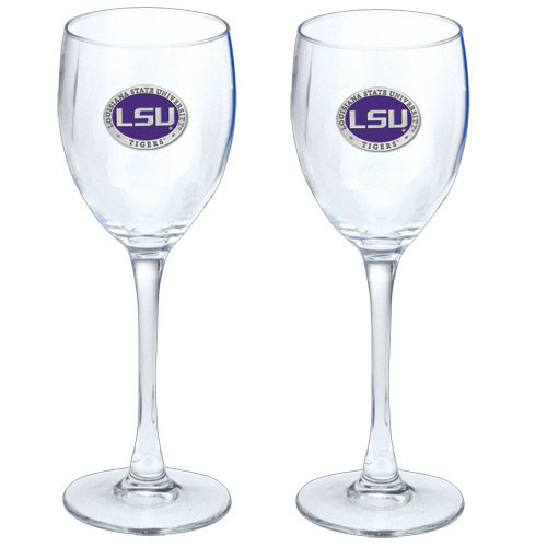 This is a set of two 12 ounce glass goblets with a fine pewter logo medallion bonded to the side. It could be used to serve water, wine or other beverages. Made in USA.