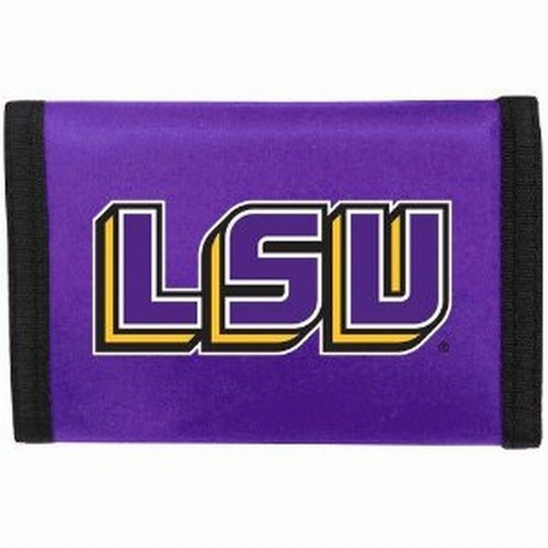 This officially licensed durable nylon wallet features vibrant LSU Tigers colors and logos. It has a compartment for money, 3 sewn in pockets and a plastic photo/credit card holder. The velcro closure keeps everything securely inside. Measures approximately 5"x3" in size.