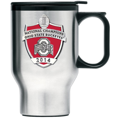 This double wall stainless steel Ohio State Buckeyes 2014 National Champions Colored Logo Travel Mug is insulated and it is stainless inside and out. It is embellished with a fine pewter decorative casting. The lid has a non-spill feature. 14 oz.