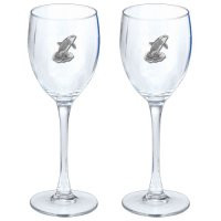 This is a set of two 12 ounce glass goblets with a fine pewter logo medallion bonded to the side. It could be used to serve water, wine or other beverages. Made in USA.