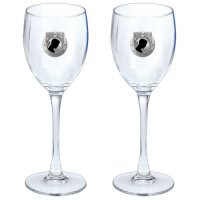 This is a set of two 12 ounce glass goblets with a fine pewter logo medallion bonded to the side. It could be used to serve water, wine or other beverages. Made in USA.