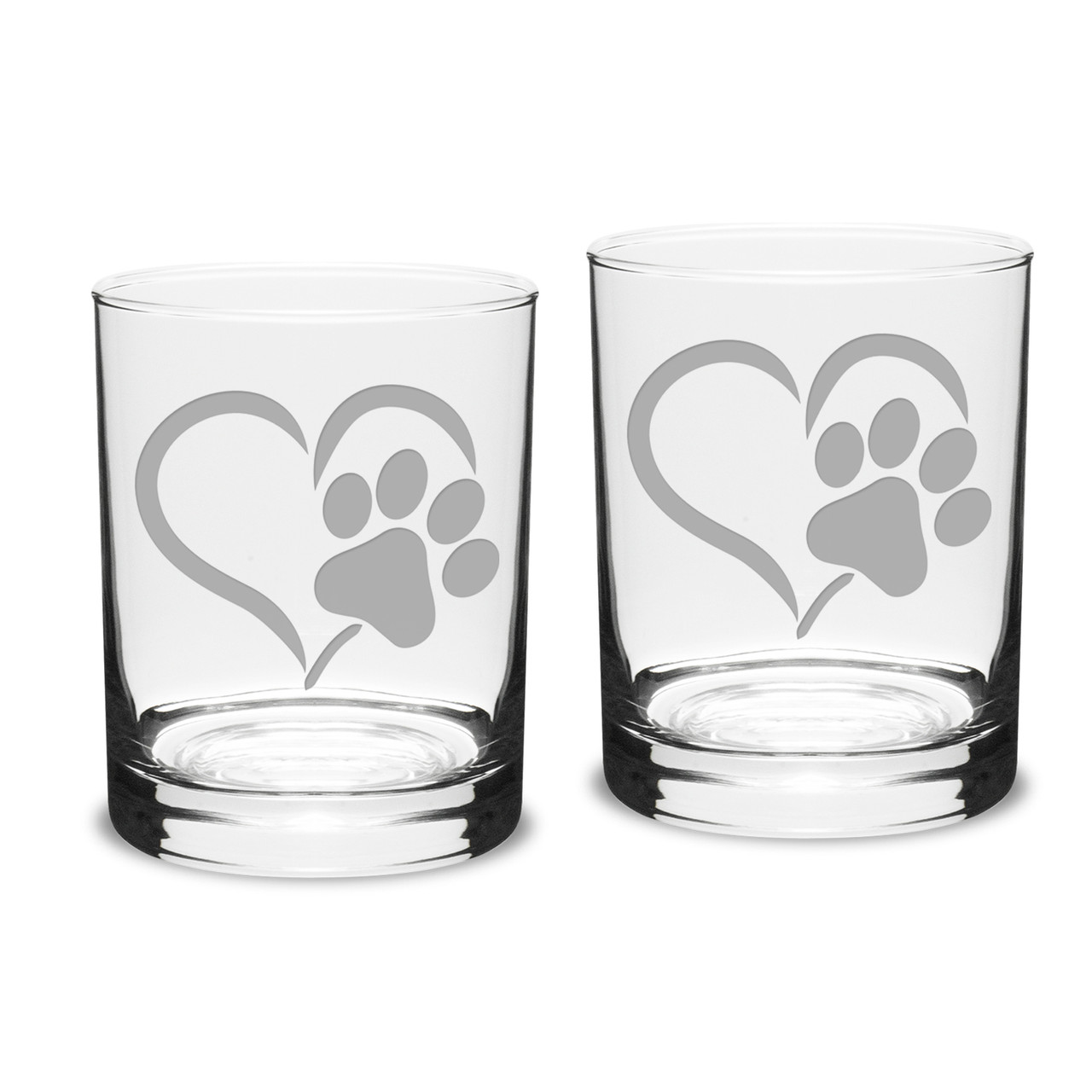 Paw Print Heart Deep Etched Classic Double Old Fashion Glass Set of 2