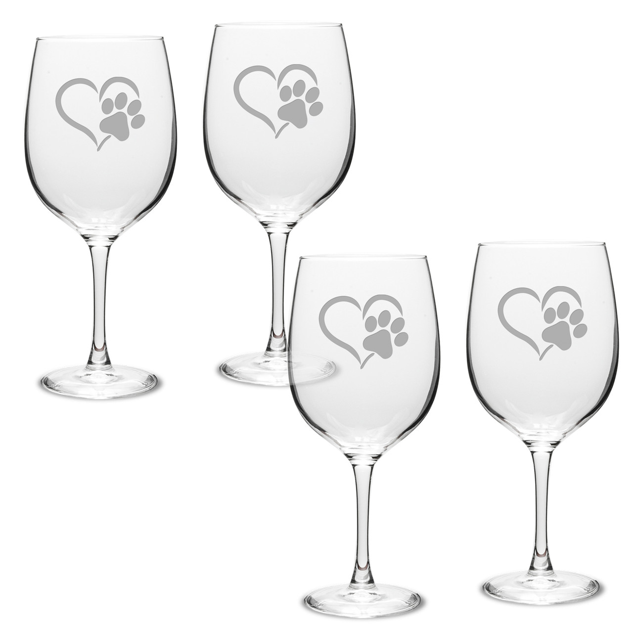 Paw Print Heart Deep Etched Classic Red Wine Glass Set of 4