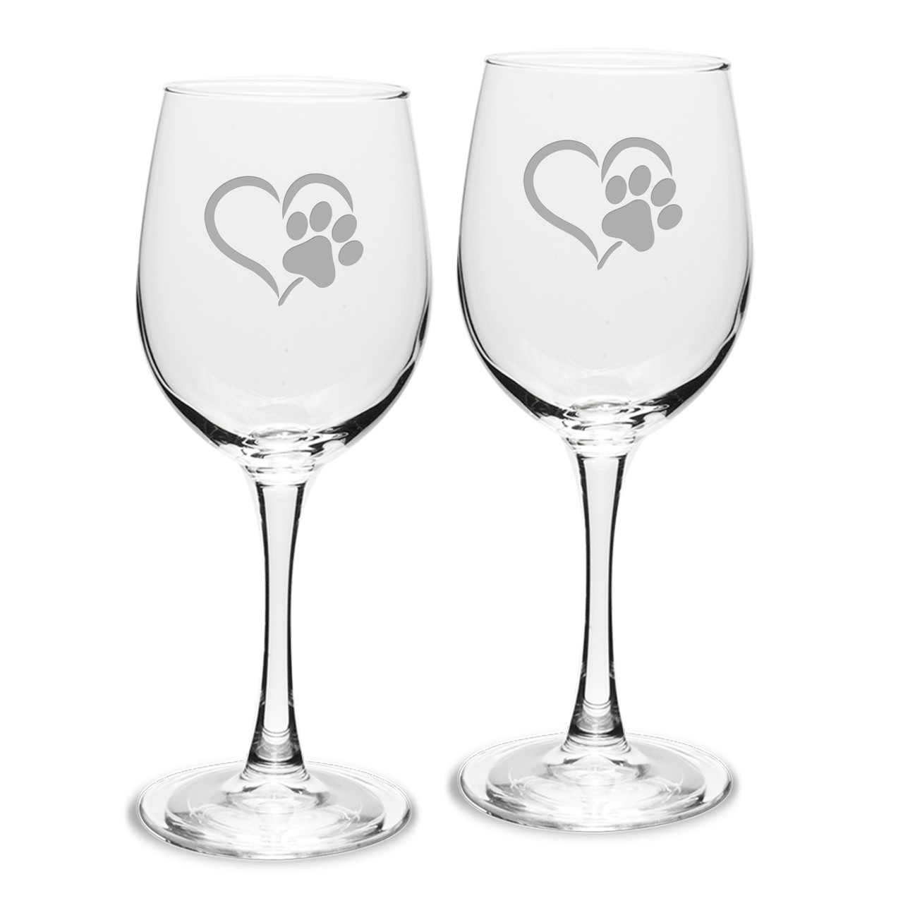 Paw Print Heart Deep Etched White Wine Glass Set of 2