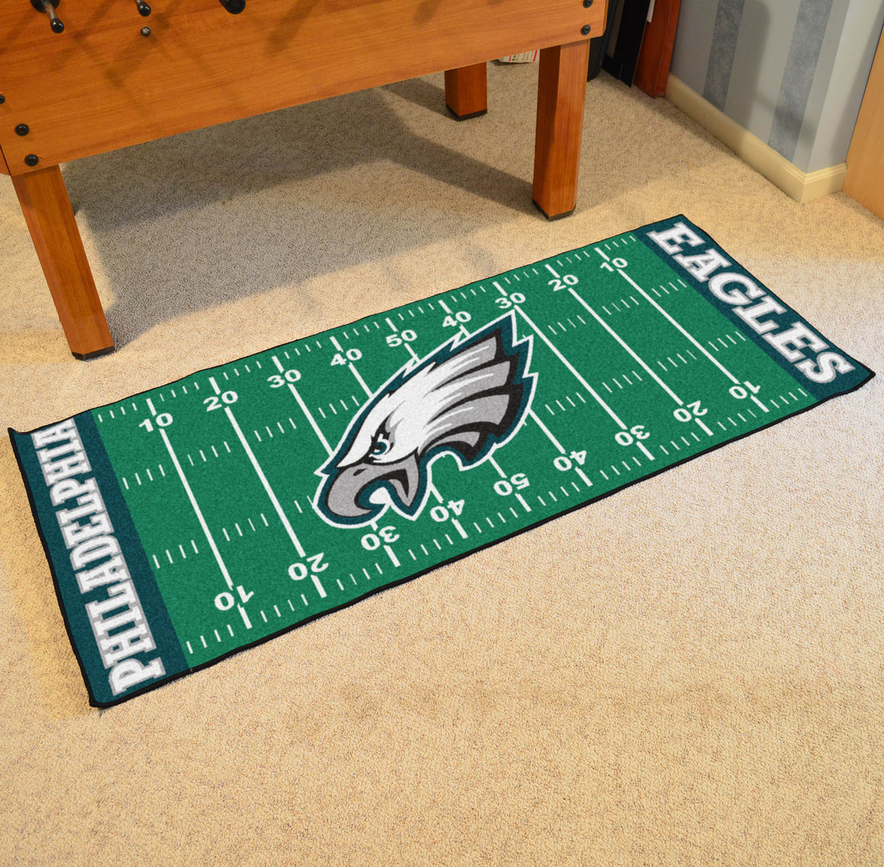 For all those football fans out there: football field-shaped area rugs by FANMATS. Made in U.S.A. 100% nylon carpet and non-skid recycled vinyl backing. Machine washable. Officially licensed. Chromojet printed in true team colors.