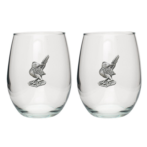 This is a set of two 15 ounce glass stemless goblets with a fine pewter logo medallion bonded to the side. It could be used to serve water, wine or other beverages. Made in USA.