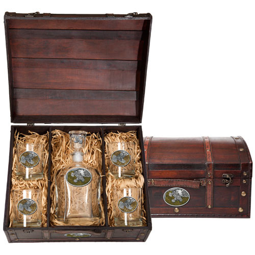 This chest boxed set contains one 24 ounce glass decanter and four (14 ounce) double old fashioned glasses. Each is embellished with a fine pewter casting.
