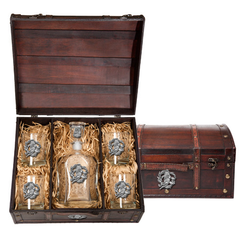 This chest boxed set contains one 24 ounce glass decanter and four (14 ounce) double old fashioned glasses. Each is embellished with a fine pewter casting.