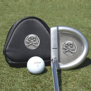 This Skull and Bones mallet style putter is engineered for perfection. It's not just pretty to look at: it will also be a valuable tool for regular use. It features a clear polycarbonate view window to highlight and protect the logo. The sole plate and logo are cast in fine pewter, and the pewter logo is also mounted on the head cover. Other attributes include a high tech face utilizing cross-groove texture for immediate over-spin on the ball, a prominent alignment line, and a natural rubber grip with soft contoured edges. Assembled in USA.