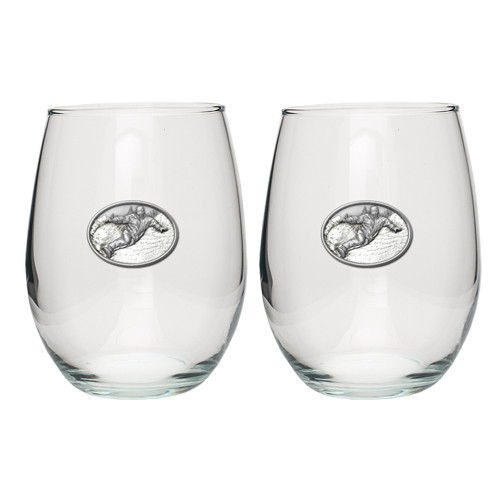 This is a set of two 15 ounce glass stemless goblets with a fine pewter logo medallion bonded to the side. It could be used to serve water, wine or other beverages. Made in USA.