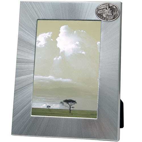 This photo frame is fabricated with brushed aluminum and accented with a fine pewter casting. It hold a 5x7 photo in a vertical position. Protective glass and easel back included. Assembled in USA.