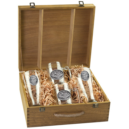 This boxed set contains two (20 ounce) glass pilsners and two (15 ounce) steins. Each is embellished with a fine pewter casting.