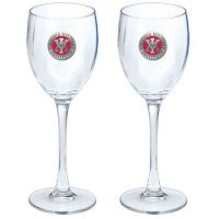 This is a set of two 12 ounce glass goblets with a fine pewter logo medallion bonded to the side. It could be used to serve water, wine or other beverages. Made in USA.