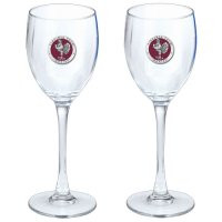 This is a set of two 12 ounce glass goblets with a fine pewter logo medallion bonded to the side. It could be used to serve water, wine or other beverages. Made in USA.