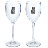 This is a set of two 12 ounce glass goblets with a fine pewter logo medallion bonded to the side. It could be used to serve water, wine or other beverages. Made in USA.