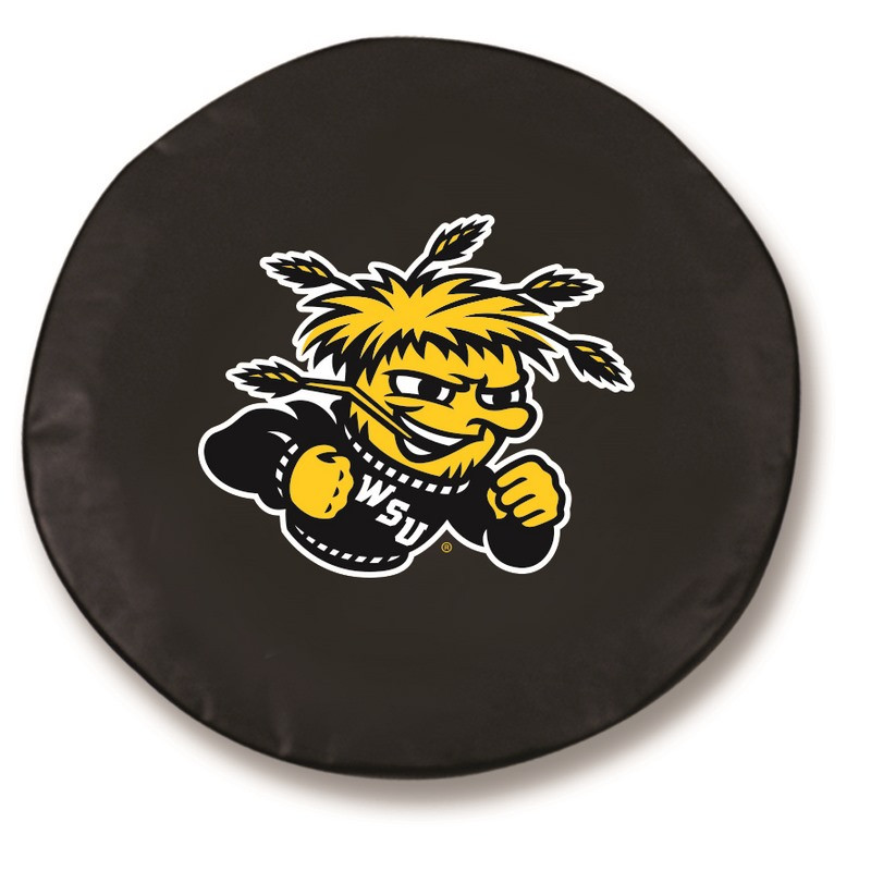These great Wichita State Shockers small black tire covers are made with a heavy gauge vinyl that has an elastic tie down for an easy fit. It is a universal fit tire cover that fits tire diameter up to 28 ? x 8. It's also water resistant, and wipes clean with a damp cloth.