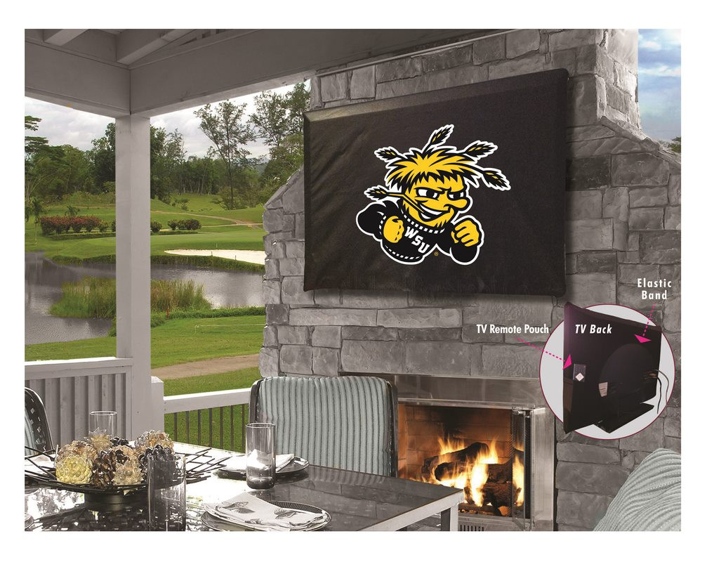 This Wichita State TV Cover is hand-made in the USA using the finest commercial grade vinyl and utilizing a step-by-step screen print process to give you the most detailed logo possible. UV resistant inks are used to ensure exceptional durability to direct sun exposure. Spandex-like material wraps around the back of the TV, keeping moisture out while allowing heat out and helping to prevent overheating. Back opening allows a fit on any wall mount, and bungee allows cover to be cinched down securely. Cover also contains a pocket for remote control storage. This product is Officially Licensed, so you can show your pride while protecting your TV from the elements of nature. Keep your TV protected and support your team with the help of Covers ! Fits TV sizes 50" to 56".
