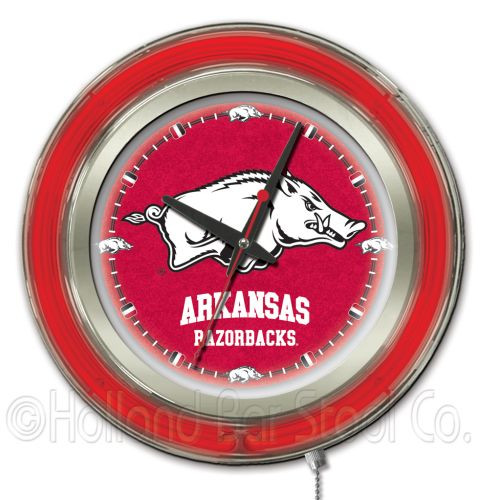 This Arkansas Razorbacks Neon Clock is a perfect way to show your team pride. Chrome casing and a team specific neon ring accent a custom printed clock face, lit up by an brilliant white, inner neon ring.