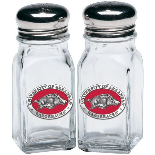 This high quality Arkansas Razorbacks Salt and Pepper Shaker Set is officially licensed and features a colored pewter logo of your favorite team. This unique product makes a great gift! Made in the USA.