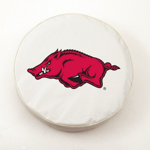 These great Arkansas Razorbacks small white tire covers are made with a heavy gauge vinyl that has an elastic tie down for an easy fit. It is a universal fit tire cover that fits tire diameter up to 28 ? x 8. It's also water resistant, and wipes clean with a damp cloth.