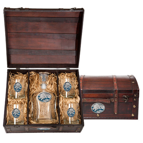 This chest boxed set contains one 24 ounce glass decanter and four (14 ounce) double old fashioned glasses. Each is embellished with a fine pewter casting.