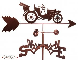 This is a real working weathervane. They are all made with pride by a small family business located in the US. The weathervane is made of a strong 16 gauge steel. The top of the weathervane pivots on a strong stainless steel pin. The wind-cups have a sealed ball bearing that will spin with the slightest breeze. The entire weathervane is covered with copper vein colored powder coat paint. Baked on Paint.