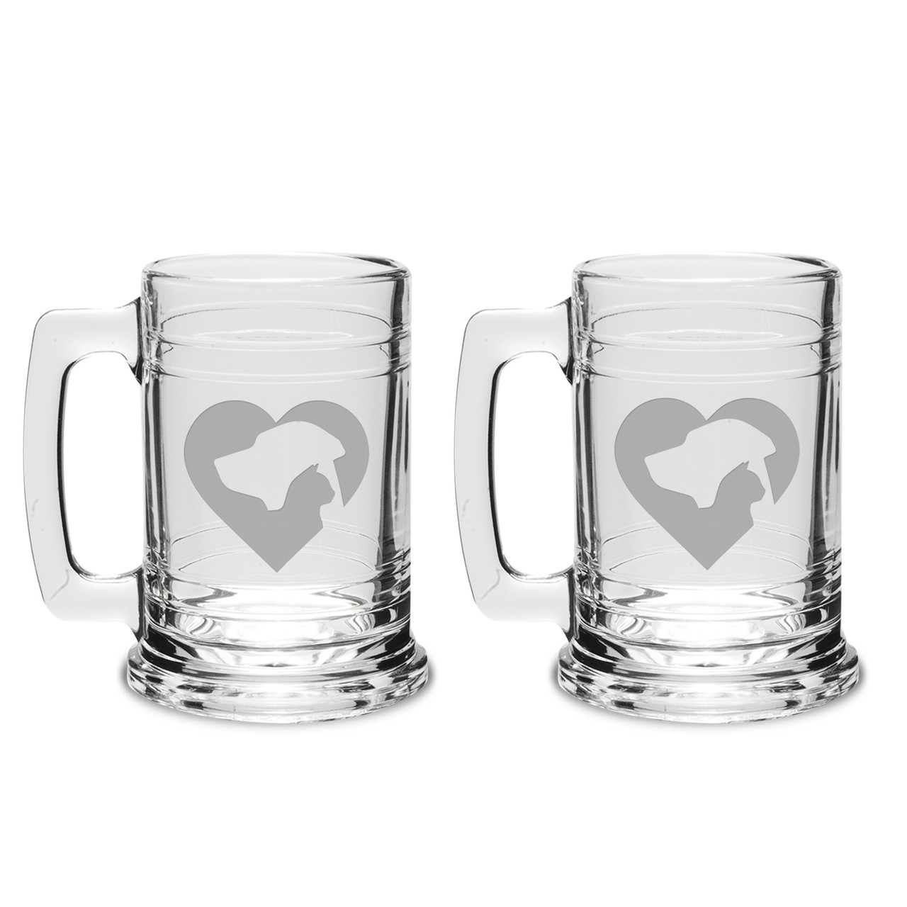 Cat Dog Heart Deep Etched Glass Tankard Mug Set of 2
