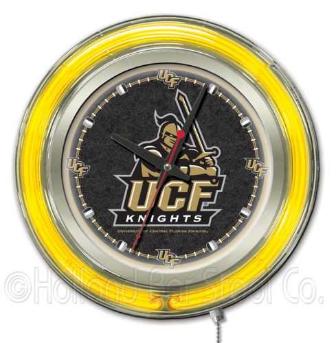 This Central Florida Golden Knights Neon Clock is a perfect way to show your team pride. Chrome casing and a team specific neon ring accent a custom printed clock face, lit up by an brilliant white, inner neon ring.