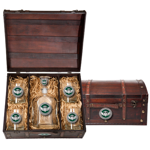 This chest boxed set contains one 24 ounce glass decanter and four (14 ounce) double old fashioned glasses. Each is embellished with a fine pewter casting.