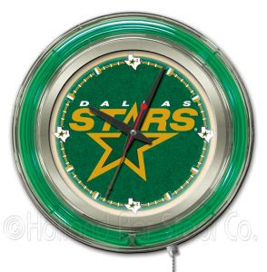 This Dallas Stars Neon Clock is a perfect way to show your team pride. Chrome casing and a team specific neon ring accent a custom printed clock face, lit up by an brilliant white, inner neon ring.